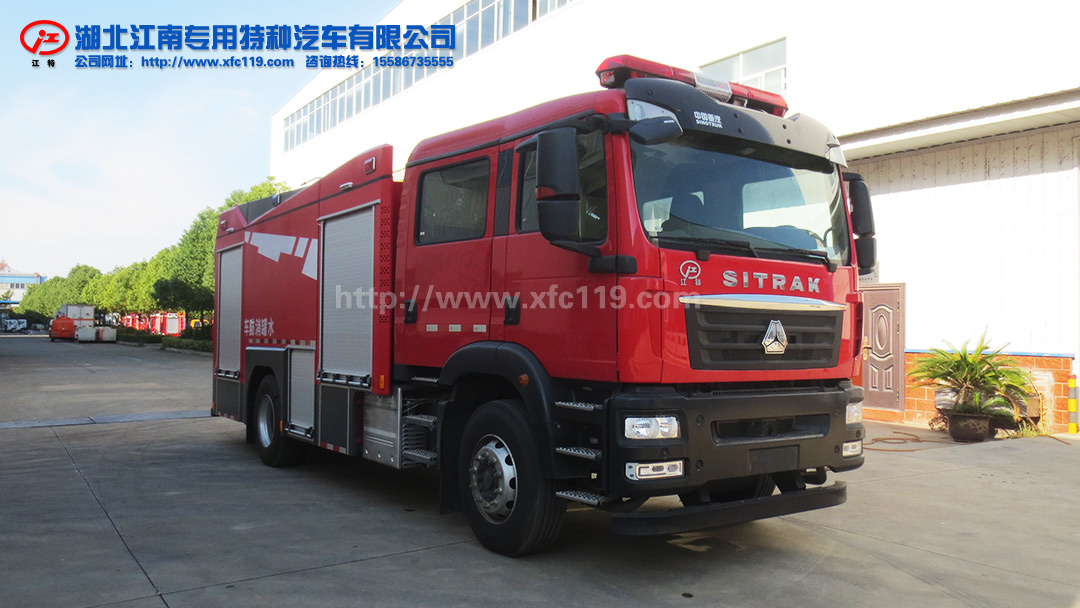 JDF5180GXFSG70/Z6型水罐消防車(chē)采用中國(guó)重汽集團(tuán)濟(jì)南商用車(chē)ZZ5206N471GF5底盤(pán)改裝而成。整車(chē)由消防員乘員室和車(chē)身兩大部分組成,乘員室為原裝雙排,可乘坐2+4人,該車(chē)為外露罐結(jié)構(gòu),車(chē)身前部為器材箱,中部為罐體,后部為泵房。載液罐體為優(yōu)質(zhì)碳鋼,內(nèi)部噴涂環(huán)氧底漆及環(huán)氧瀝青漆,與底盤(pán)采用彈性連接,載水7150kg,裝備了上海雄真消防設(shè)備有限公司生產(chǎn)CB10/60-XZ型常壓消防泵,額定流量60L/S,車(chē)頂安裝成都威斯特消防機(jī)械有限公司生產(chǎn)的P8/60W型車(chē)用消防炮。該車(chē)最大的特點(diǎn)是載液量大、操控性好、維修簡(jiǎn)便。可廣泛應(yīng)用于公安消防隊(duì)、廠礦企業(yè)及社區(qū)、碼頭等場(chǎng)所,撲救大型油類(lèi)火災(zāi)和一般物質(zhì)火災(zāi)。