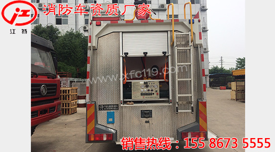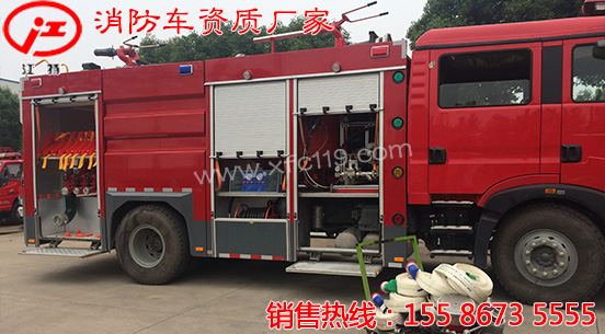 豪沃T5G江特牌JDF5190GXFGL70/Z干粉水聯(lián)用消防車,軸距4700MM,MAN發(fā)動機340馬力,上戶噸位2立方干粉,4.75立方水。