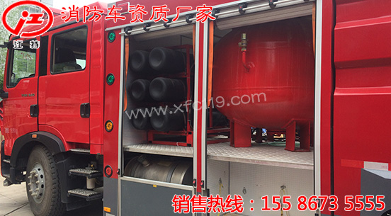 豪沃T5G江特牌JDF5190GXFGP70/Z干粉泡沫聯(lián)用消防車,軸距4700MM,MAN發(fā)動機340馬力,上戶噸位2立方干粉,2.8立方水,1.912立方泡沫。