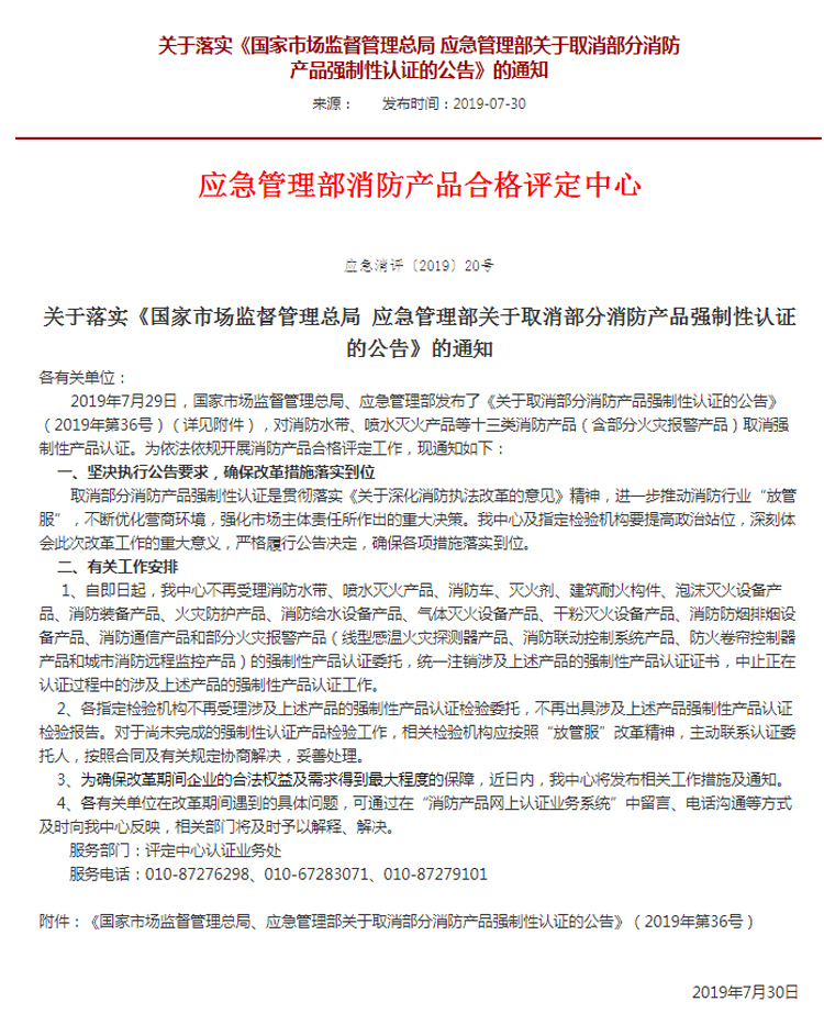 下面為廣大用戶解讀下這次重要通知的意思,該文件內容主要針對消防產品,消防車包含在內,是關于取消消防車3C認證的通知,根據國家應急管理部消防產品合格評定中心于2019.7.30發布的(應急消評2019/20號)關于取消部分消防產品強制性認證公告。所有國五消防車強制性認證證書從2019年8月1日全部為注銷狀態,我公司新的國五消防車和國六消防車自愿認證正在轉換中。因此根據文件要求,以前的原證書不得再流出使用。