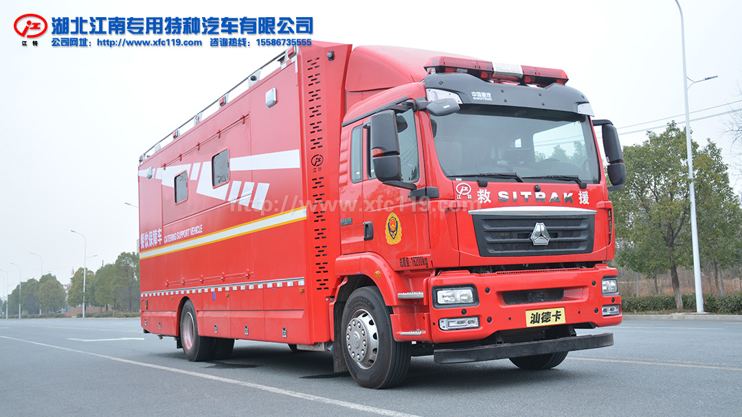 整車上裝為整體式框架結構,龍骨采用優質型材焊接,外蒙皮為航空鋁材,廂體四壁和頂板均為真空負壓復合板材結構,廂體外廓采用專用鋁型材包角,滿足輕量化和整車強度要求。車輛頂部四周配備頻閃警燈及場地照明燈,下裙邊設計有專用雜物艙;車門、艙門均采用專用型材結構,可靠性高并具有良好的密封性。廂體內采用優質塑膠地板,防滑防腐耐酸耐堿;廂體四壁及頂部骨架填充隔音隔熱材料,室內裝飾采用綠色環保材料,造型美觀易于清洗,防火阻燃等級符合GB8624B1標準。整車優質烤漆工藝主色為消防紅,可以根據用戶需求設計軍警制式外觀車貼。