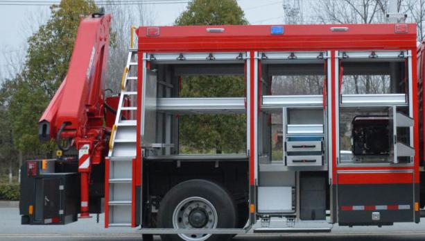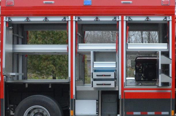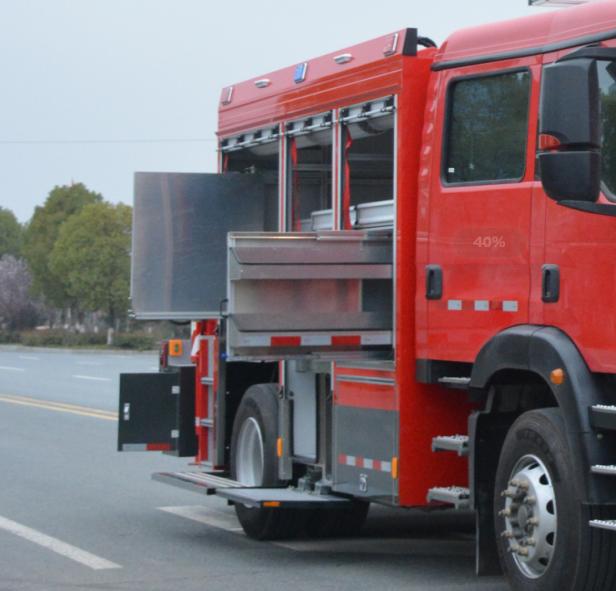 右側(cè)后器材艙布置有立式旋轉(zhuǎn)拓展板,前板裝配有雙層器具收納盒,收納存放小型工具和專用器材,背板采用掛式支架,收納專用扳手、卡鉗、剪刀等器具;右側(cè)前器材艙布置有立式抽拉拓展板機(jī)構(gòu),采用重型多節(jié)滑軌抽拉式結(jié)構(gòu),方便消防員快速取用/收納器材和專用工具等。