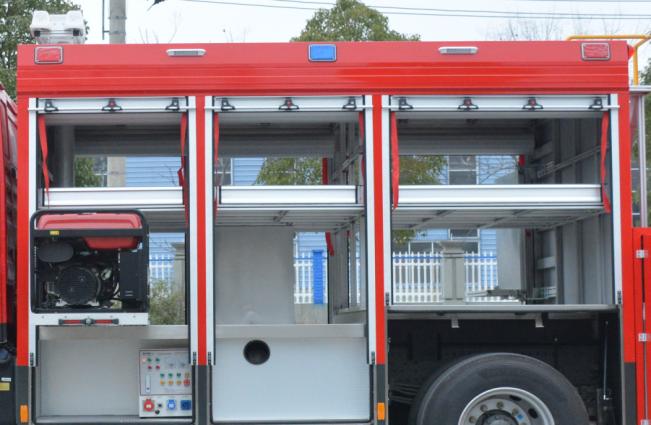 發(fā)電照明區(qū)左側(cè)器材艙布置有平式拓展板裝載汽油發(fā)電機(jī),給整車應(yīng)急供電;右側(cè)器材艙布置有立式旋轉(zhuǎn)拓展板,方便消防員快速取用/收納器材和專用工具;中間布置有大功率高桿升降照明裝置,為救援現(xiàn)場(chǎng)提供場(chǎng)地照明和指向照明,為救援現(xiàn)場(chǎng)提供可靠保障。