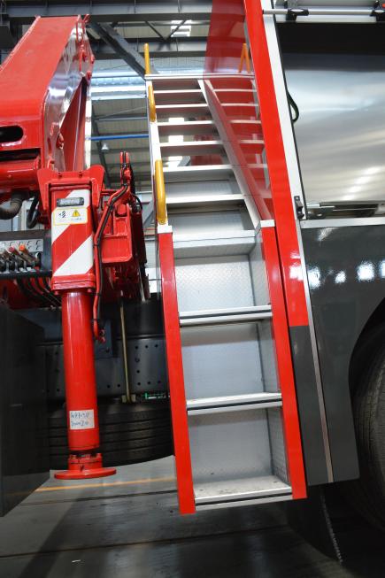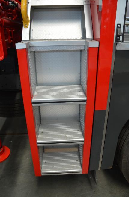 梯臺(tái)、扶手及護(hù)欄:為便于取用/收納應(yīng)急救援裝備器材,符合安全和人機(jī)工程要求,本車根據(jù)實(shí)際使用需要,設(shè)計(jì)有各種梯臺(tái)、扶手、安全護(hù)欄等輔助設(shè)施。