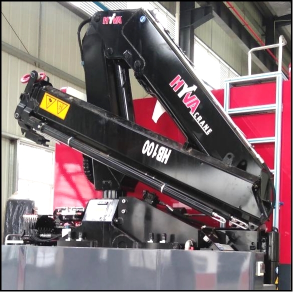 吊裝作業(yè)區(qū)主要裝備折疊臂吊裝設(shè)備,配備有伸縮臂液壓支腿及雙側(cè)操控接口,吊裝作業(yè)區(qū)左右側(cè)均配備有器材艙,放置支腿墊木等隨車器材裝備,右側(cè)還設(shè)計(jì)有登頂梯臺(tái),配備上車?yán)旨鞍踩o(hù)欄。