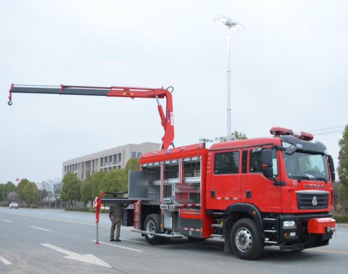整車主要由汕德卡ZZ5206N471GF5特種作業(yè)車底盤、上裝廂體、電源保障系統(tǒng)、隨車起重折臂吊機(jī)、高桿照明系統(tǒng)、器材艙、平式/立式拓展板機(jī)構(gòu)、卷簾門、梯臺(tái)及護(hù)欄、警燈警號(hào)、隨車器材等組成。