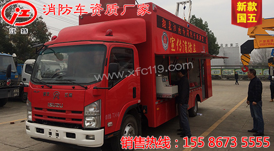 此圖片為新款國五五十鈴消防宣傳車,該車型采用重慶五十鈴公司QL1100A8MAY型國五優(yōu)質(zhì)底盤,軸距4475MM,配置節(jié)能環(huán)保靜音的4HK1-TC51五十鈴191馬力發(fā)動(dòng)機(jī),底盤扎實(shí),動(dòng)力強(qiáng)勁,機(jī)動(dòng)性強(qiáng)。